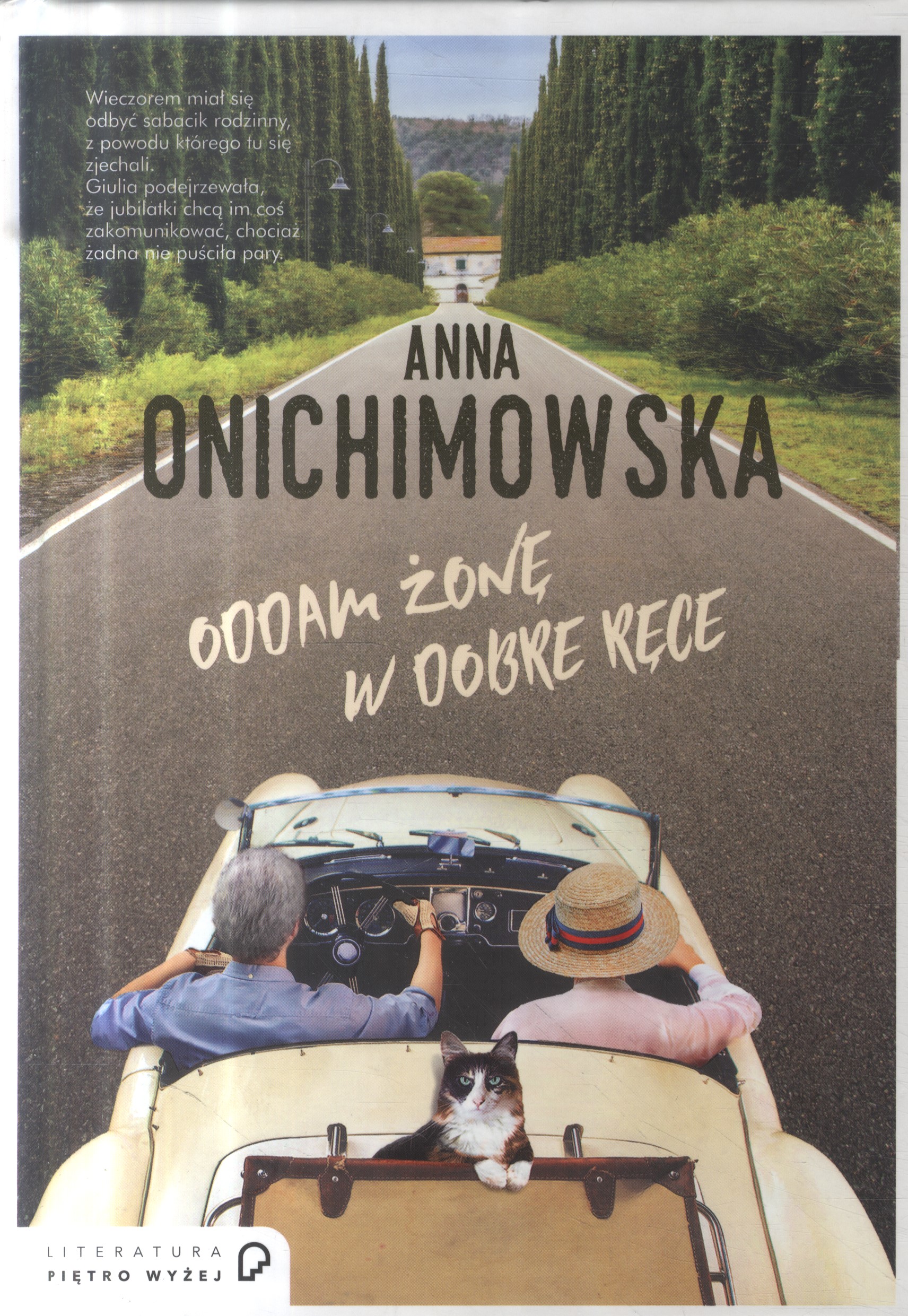 W 2019 r. ukazała się książka Anny Onichimowskiej o intrygującym tytule Oddam żonę w dobre ręce. (...) To idealna książka do czytania po ciężkim dniu. Można przy niej odpocząć, przenieść się do włoskich miast, poznać nieszablonowych bohaterów, rodzące się lub gasnące uczucia, a jednocześnie się uśmiechać. Czytelnik poznaje niezwykle energiczne bliźniaczki – Annę i Simonę, które po pół wieku postanawiają urządzić przyjęcie urodzinowe. Tradycyjnie wzbudza to w członkach rodziny napięcie, radość, ale i zaskoczenie. Zaczynają zastana wiać się, co się wydarzy. Może podział majątku, a może informacja o chorobie… Nic bardziej mylnego, ale o tym musicie przekonać się sami.