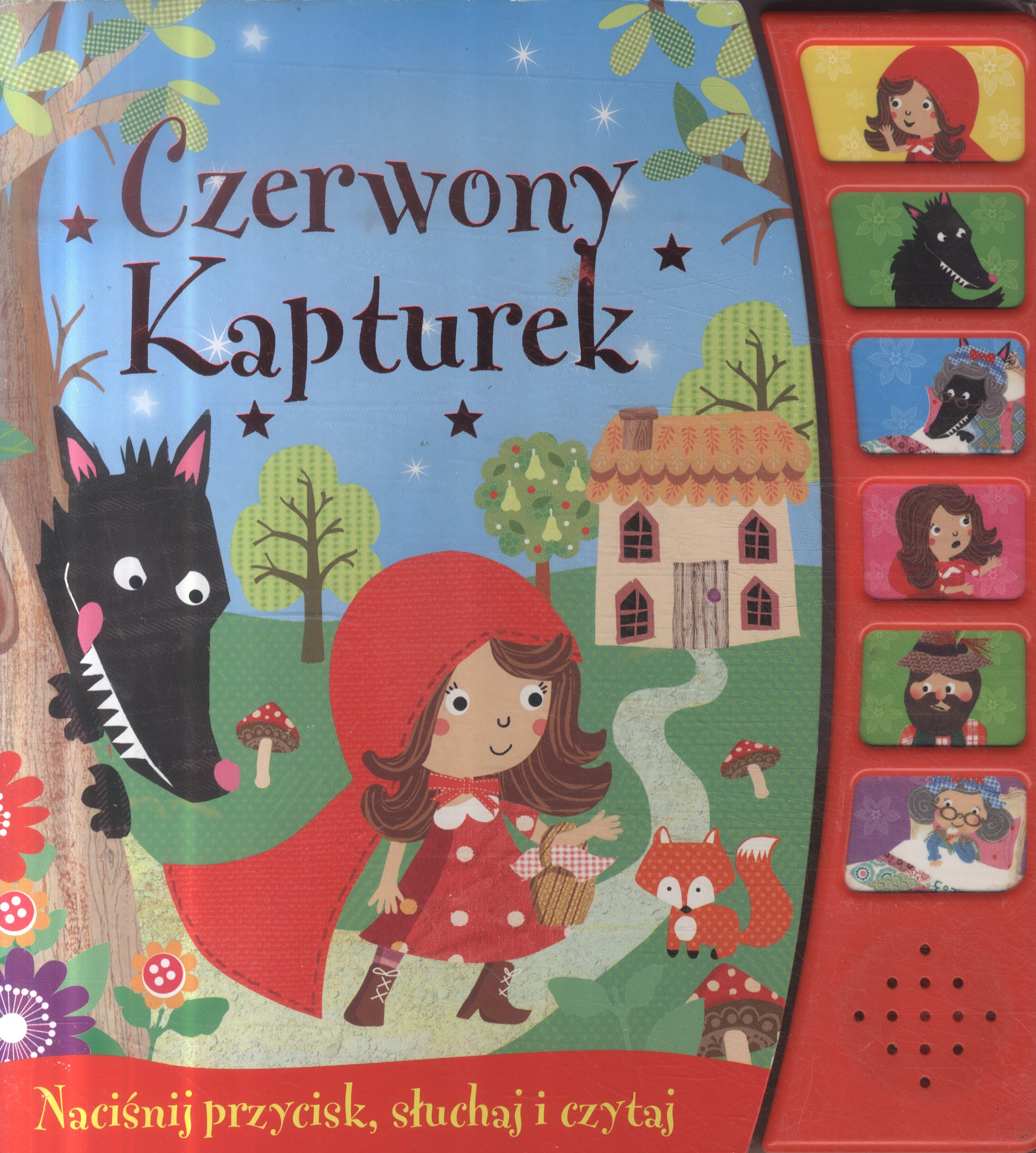 Przenieś się do krainy bajek. Naciskając kolejno sześć dźwiękowych przycisków, usłyszysz śliczną historię o pewnej odważnej małej dziewczycne, która na swojej drodze napotkała złego wilka.
