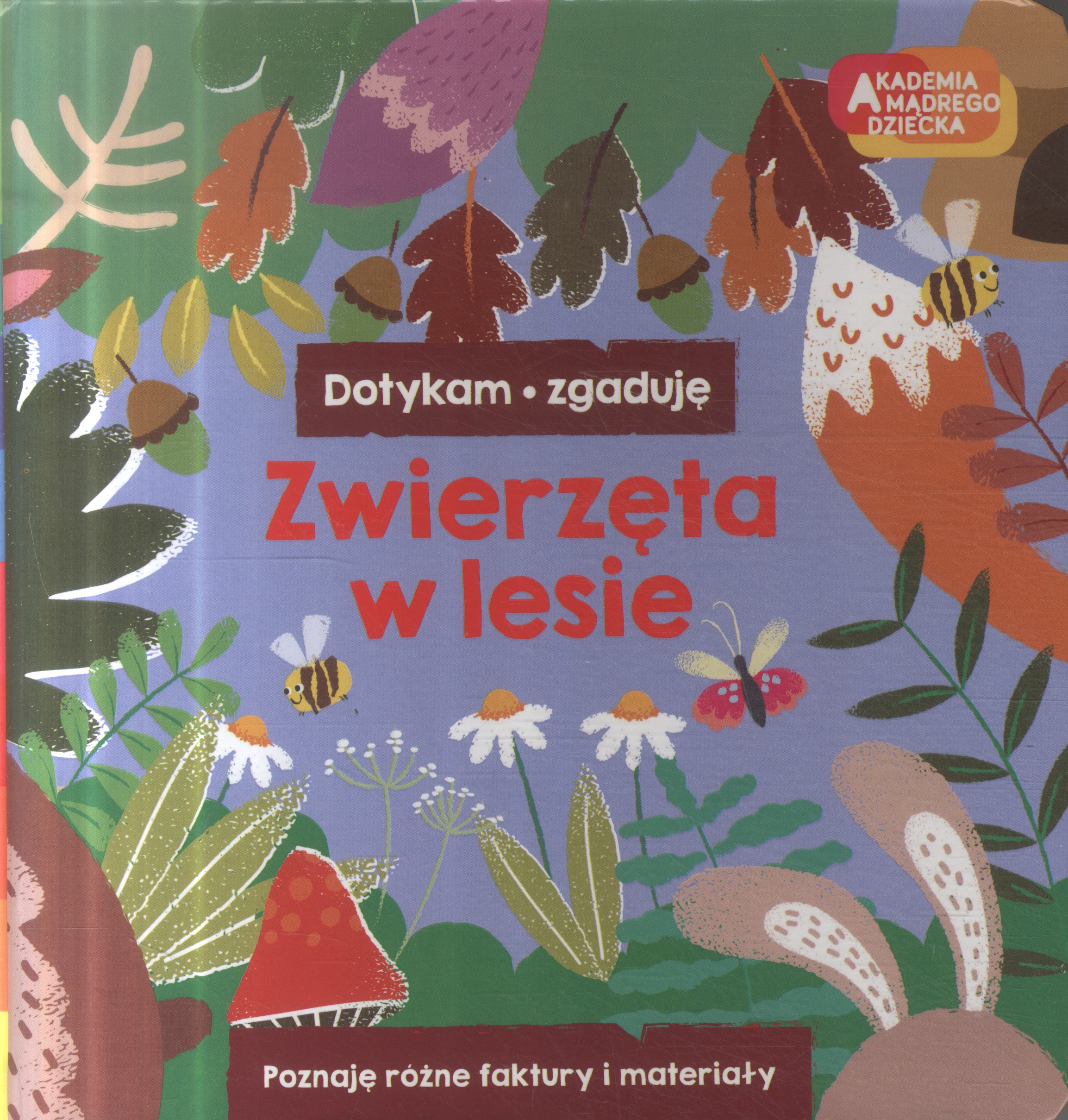 Dotykam, zgaduję to nowa seria książeczek w ofercie Akademii Mądrego Dziecka. Zwierzęta w lesie to duża, kartonowa książeczka, która zachęca dziecko oraz dorosłego do wspólnej zabawy i czytania. Na każdej rozkładówce mamy fragment materiału do dotknięcia, pogłaskania oraz tekst, który jest wskazówką jakie to może być zwierzątko. Próbujemy razem z dzieckiem odgadnąć, a następnie możemy zachęcić małego czytelnika do otworzenia dużej klapki i sprawdzenia jakie zwierzątko tam się ukryło. W książeczce przedstawione są: niedźwiadek, zając, jeleń, sowa oraz lis. Dzięki użyciu różnych struktur dziecko pobudza zmysł dotyku oraz ćwiczy koordynację wzrokowo- ruchową. Jest to też świetna zabawa i wspólnie spędzony czas.