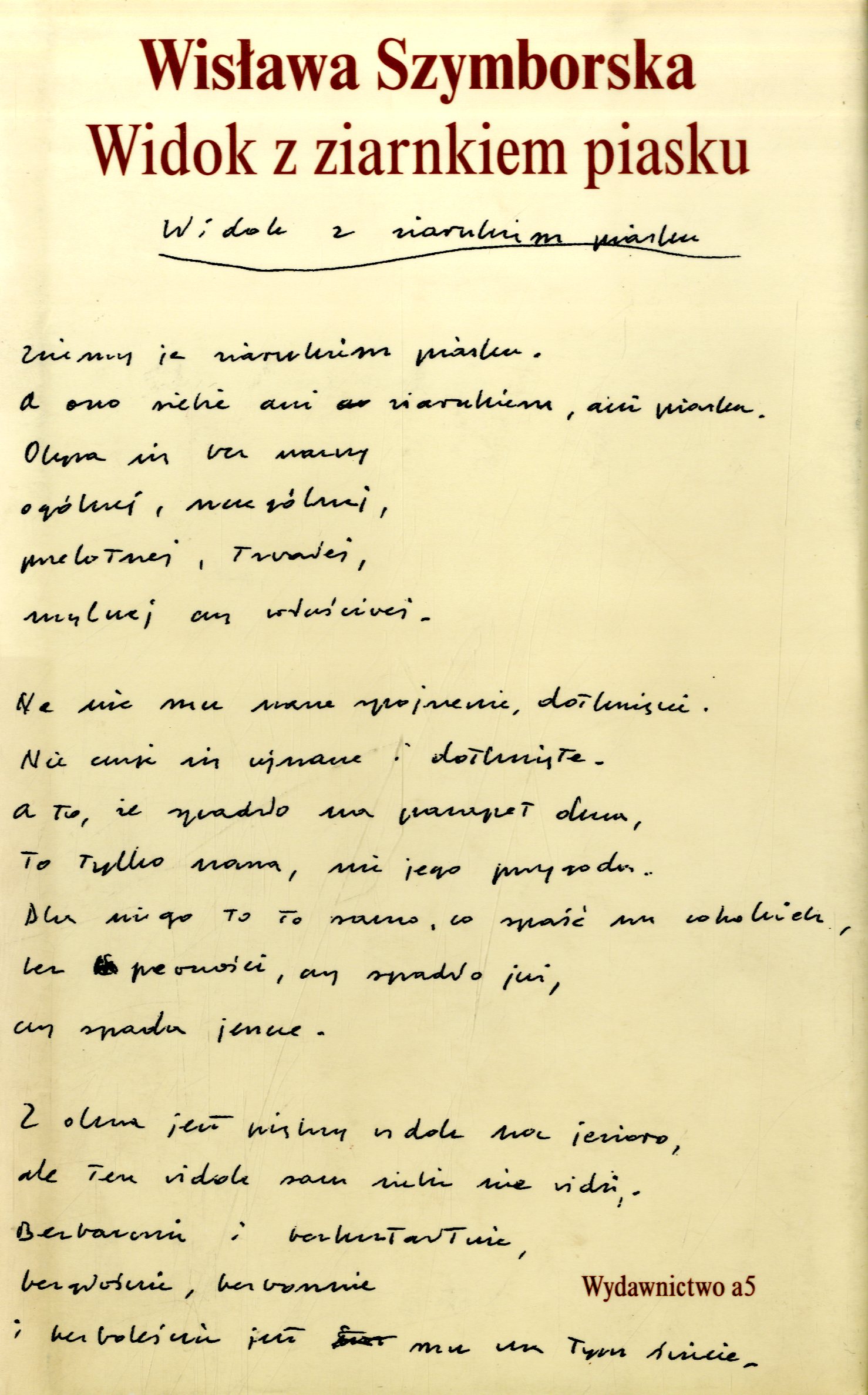 Widok z ziarnkiem piasku : 102 wiersze / Wisława Szymborska. - Wydanie pierwsze - dodruk. - Poznań : Wydawnictwo a5, 1997. - 186, [5] stron ; 21 cm.