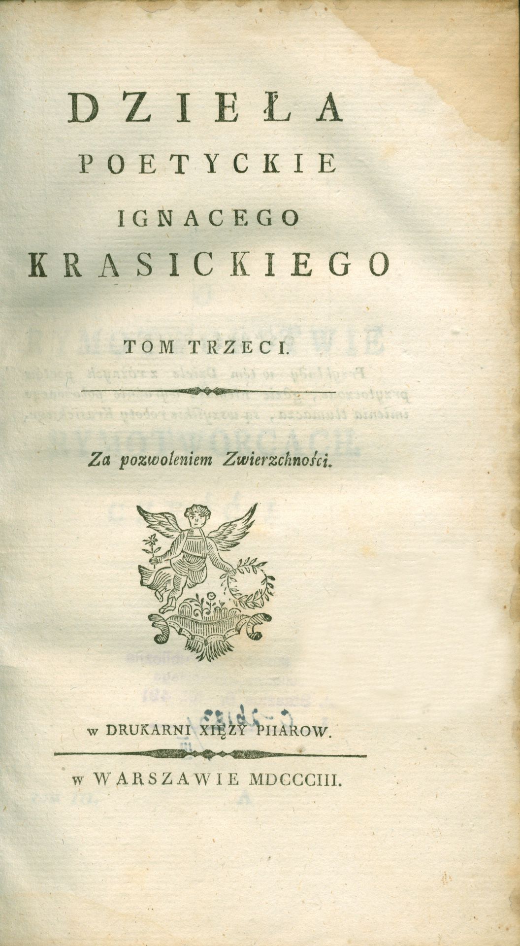 Dzieła poetyckie. T. 3 / Ignacy Krasicki. - Wyd. nowe i zupełne. - Warszawa : [nakł. F.Dmochowskiego], 1803. - 491 s. ; 20 cm.