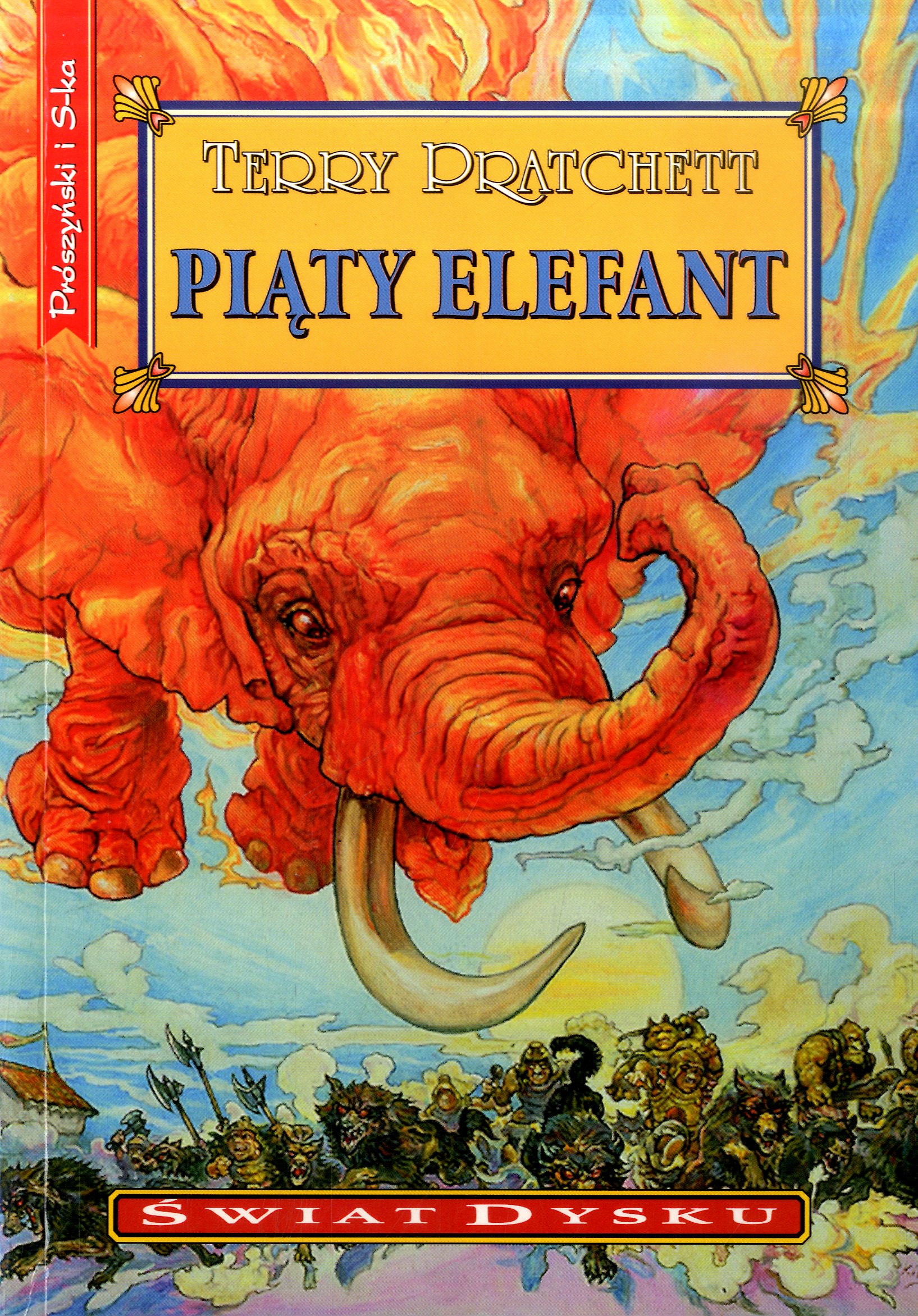 Sam Vimes jest uciekinierem. Wczoraj był diukiem, komendantem policji i ambasadorem w tajemniczej, bogatej w tłuszcz krainie Uberwald.Teraz nie ma nic prócz wrodzonej pomysłowości i smętnych portek wujaszka Wani (nie pytajcie). Pada śnieg. Jest mróz. I jeśli nie przedrze się przez las do cywilizacji, wybuchnie straszliwa wojna.Ale jego tropem podążają potwory. Są inteligentne. Są szybkie. Są wilkołakami a i już go doganiają. „Piąty elefant” to najnowsza powieść Terry'ego Pratchetta o świecie Dysku. Tym razem w rolach głównych: krasnoludy, dyplomacja, intryga i wielkie bryły tłuszczu.