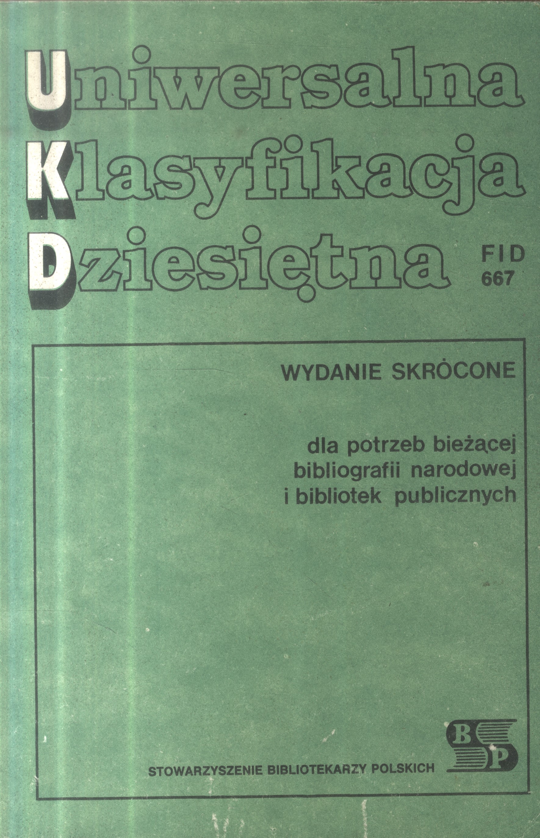 Uniwersalna Klasyfikacja Dziesiętna FID 667 / [oprac. Jadwiga Czarnecka, Henryk Sawoniak]. - Wyd. skrócone dla potrzeb bieżącej bibliografii narodowej i bibliotek publicznych aktualne wg Extensions and Corrections to the UDC Series 12 No 2 1985. - Warszawa : Stowarzyszenie Bibliotekarzy Polskich, 1988. - 217, [1] s. ; 24 cm.