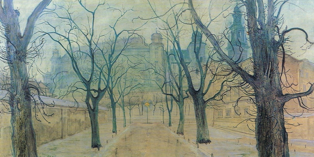 Przedstawia : Planty z widokiem na Wawel, inna nazwa obrazu : Planty o świcie, olej na płótnie, wymiary 161x201,5 cm, 1894 r. Własność prywatna