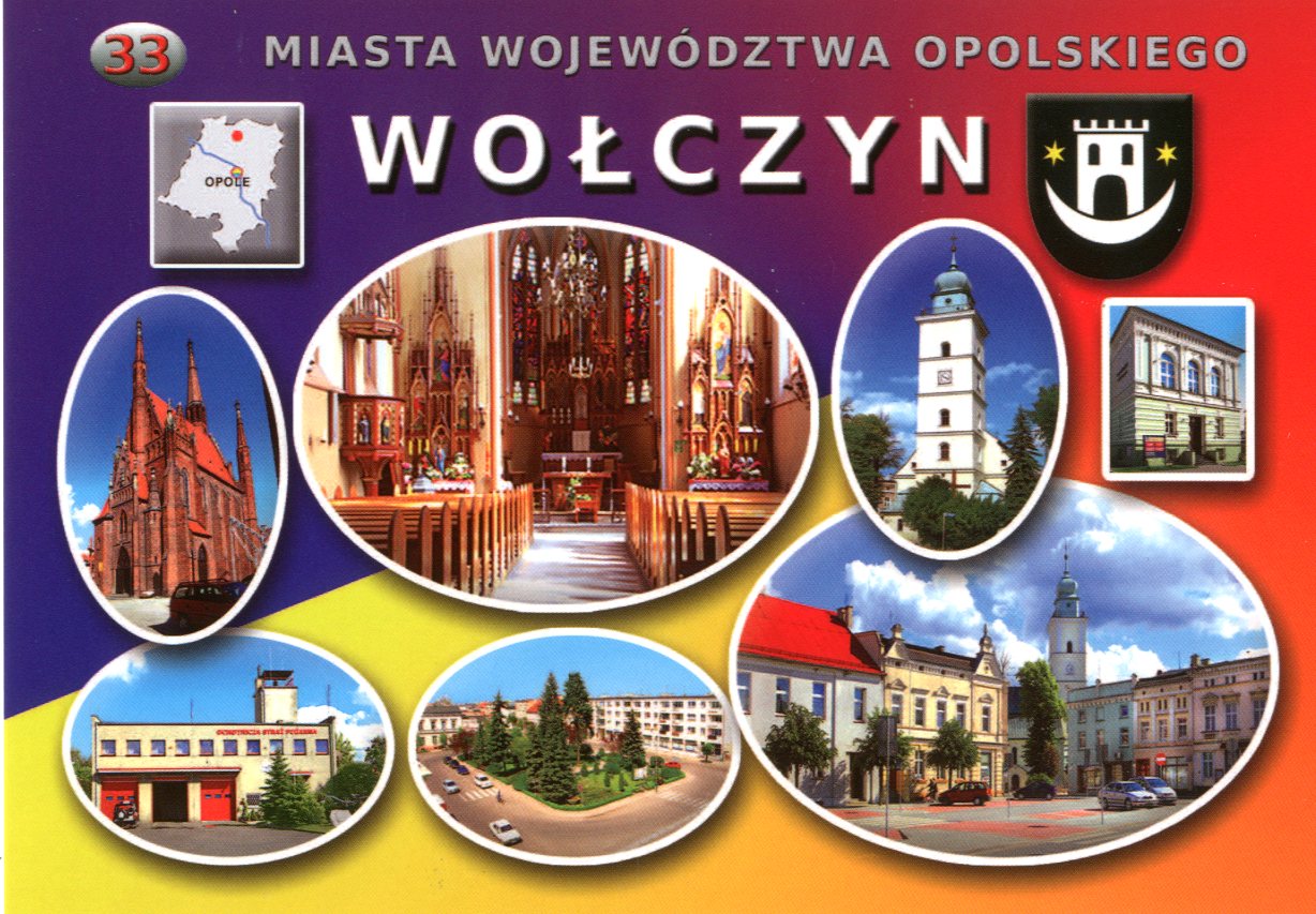 Kościół NMP Niepokalanie Poczętej i wnętrze kościoła ; Kościół pw. św. Teresy ; Budynek Urzędu Miejskiego ; Fragment rynku - w głebi kościół pw. św. Teresy ; Fragment rynku ; Budynek Ochotniczej Straży Pożarnej.