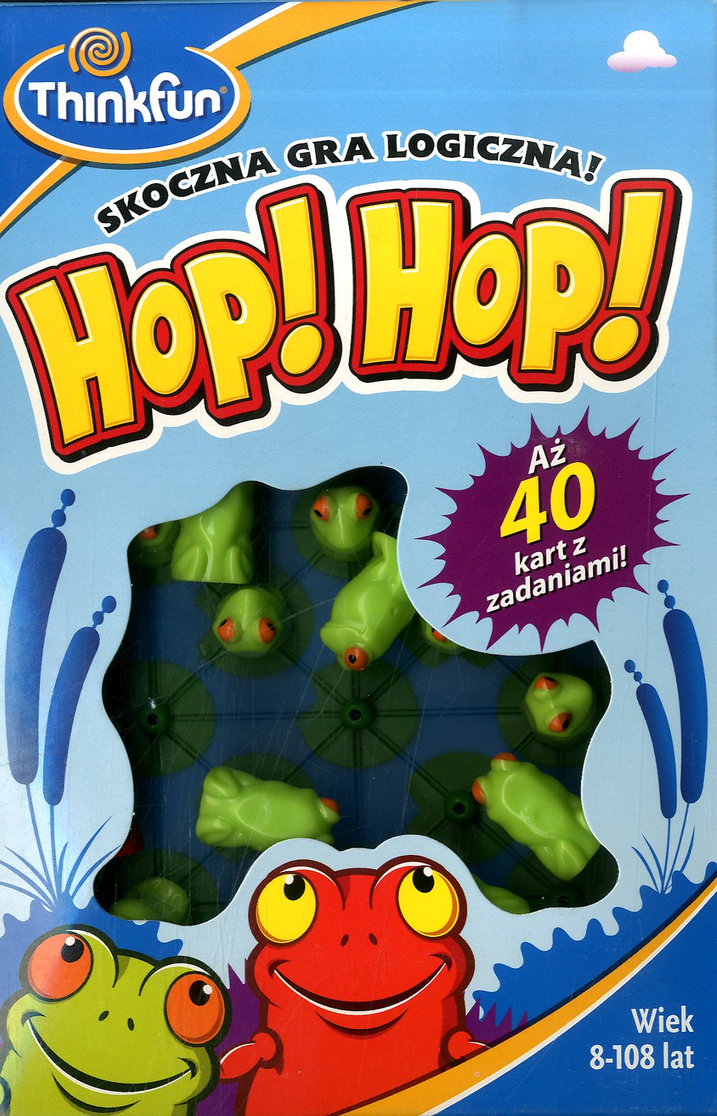 Pudełko zawiera : plansza do gry, 40 kart z zadaniami, 1 czerwona żabka, 11 zielonych żabek, instrukcja.