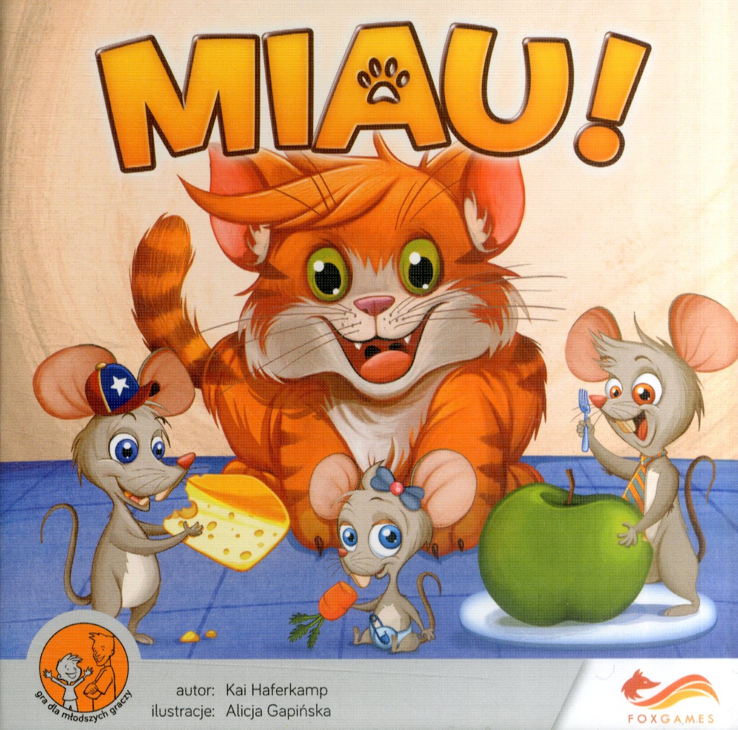 Miau! / Kai Haferkamp, il. Alicja Gapińska. - Warszawa : FoxGames. Grupa Wydaw. Foksal, cop. 2013. - 1 plansza, żetony ; wym. pudełka 13x13x4,5 cm +instrukcja.