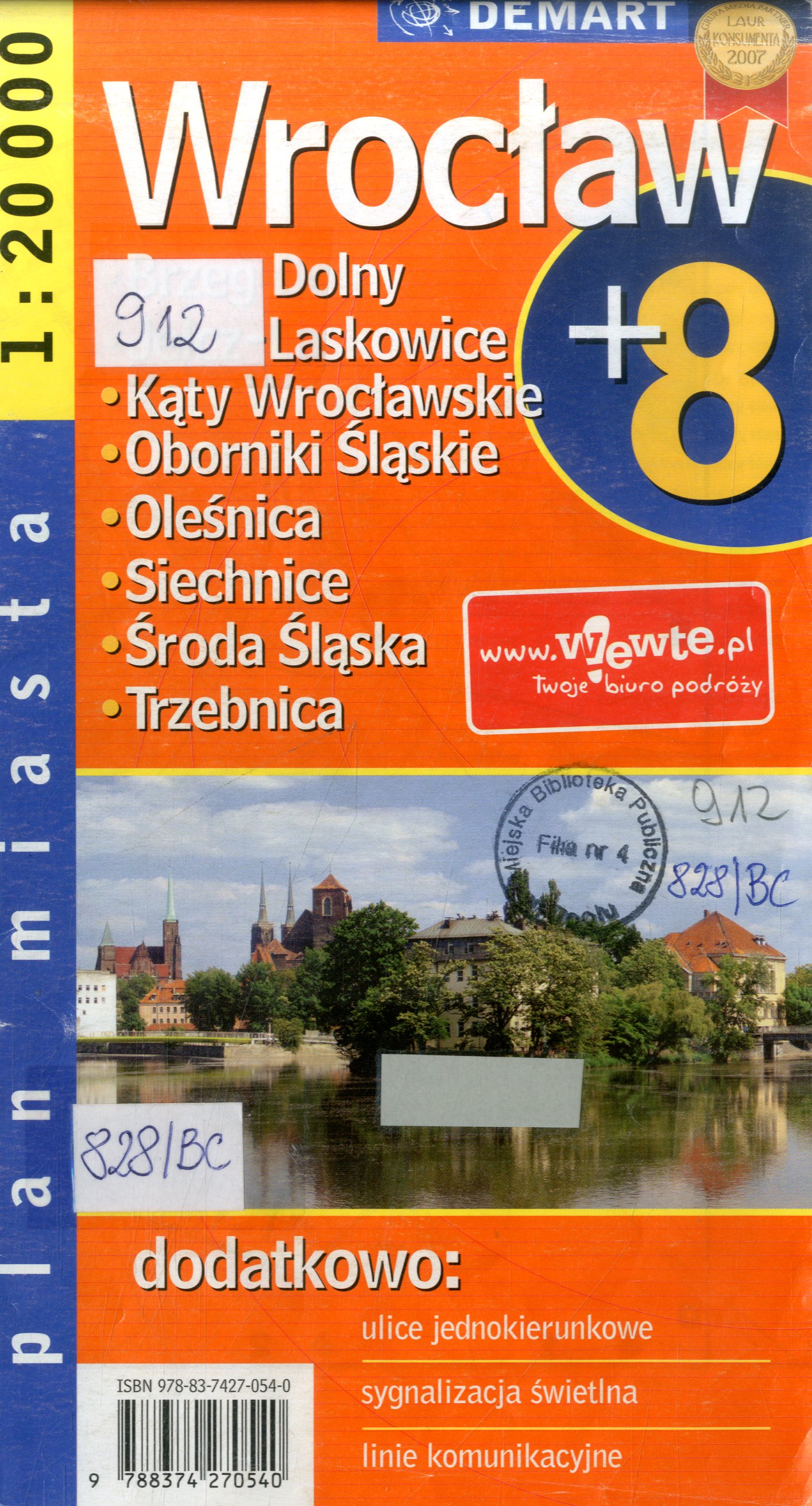 Mapy poboczne: Centrum Wrocławia, 1:10 000, 33x29 cm; Okolice Wrocławia, 1:300 000, 22x24 cm; Brzeg Dolny, 1:20 000, 17x15 cm; Jelcz-Laskowice, 1:20 000, 23x30 cm; Kąty Wrocławskie, 1:20 000, 12x15 cm; Siechnice, 1:20 000, 11x15 cm; Oborniki Śląskie, 1:20 000, 23x15 cm; Oleśnica, 1:22 200 [!], 21x27 cm; [Oleśnica - Starówka], [ca 1:10 750], 7x6 cm; Środa Śląska, 1:20 000, 22x15 cm; Trzebnica, 1:20 000, 17x15 cm.