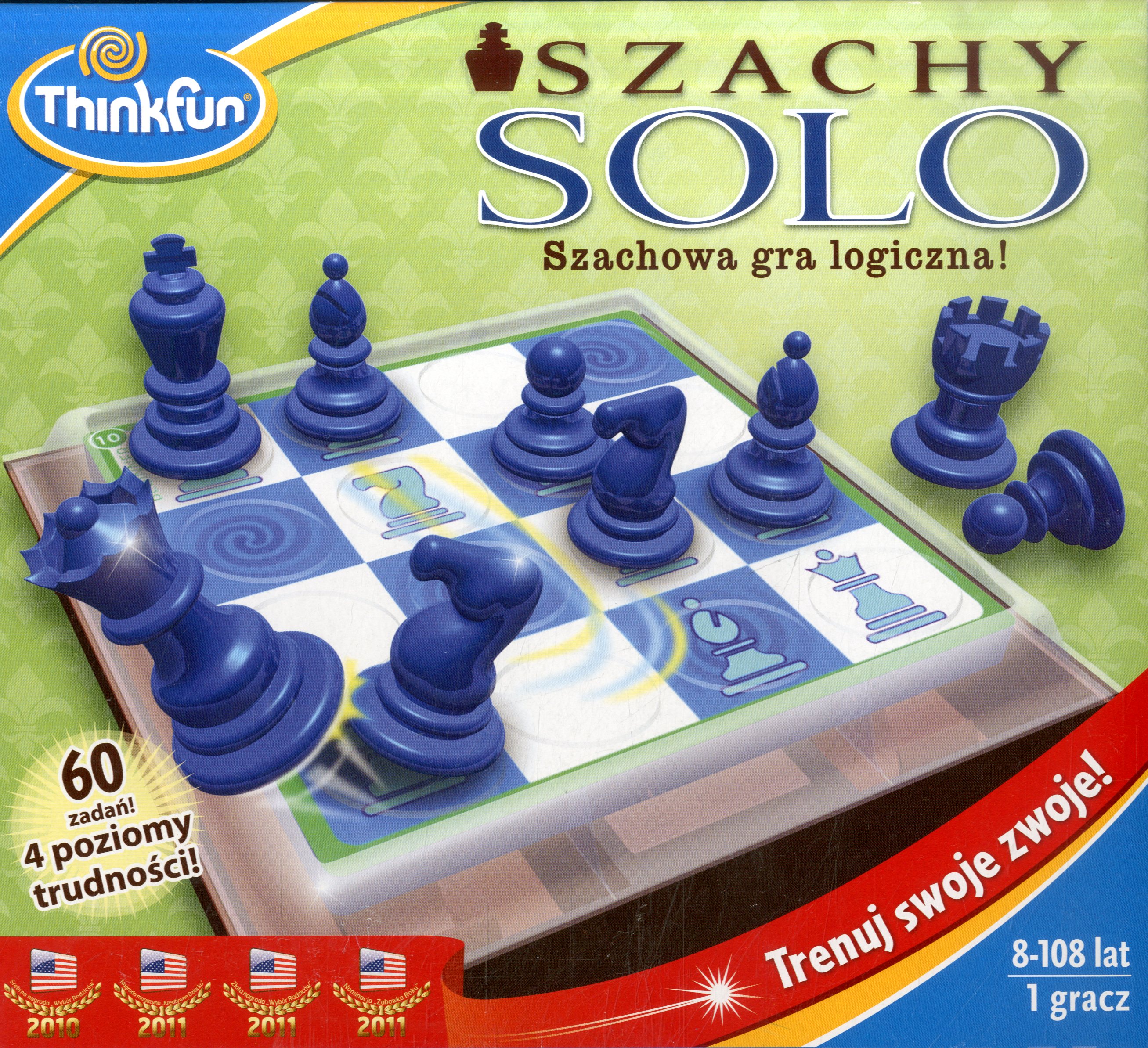 Pudełko zawiera : plansze-60 zadań, 10 figur szachowych, instrukcja.