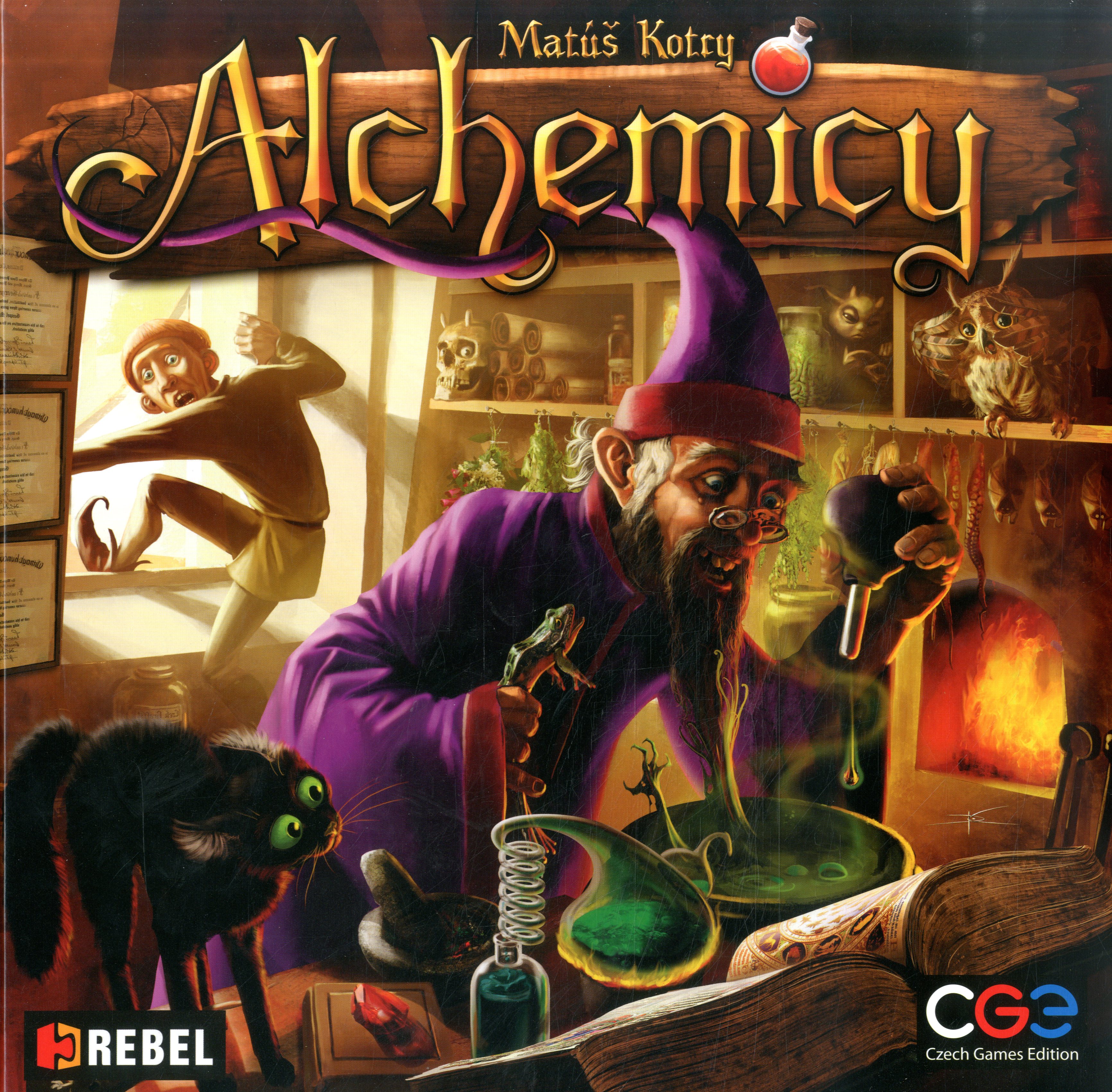 Alchemicy / Matúš Kotry ; [il. David Cochard ; tł. Ryszard Chojnowski]. - Gdańsk: Rebel cop. 2014. - plansze, karty, żetony, znaczniki, kafle ; wym. pudełka 25,5x25,5x6 cm + instrukcja.