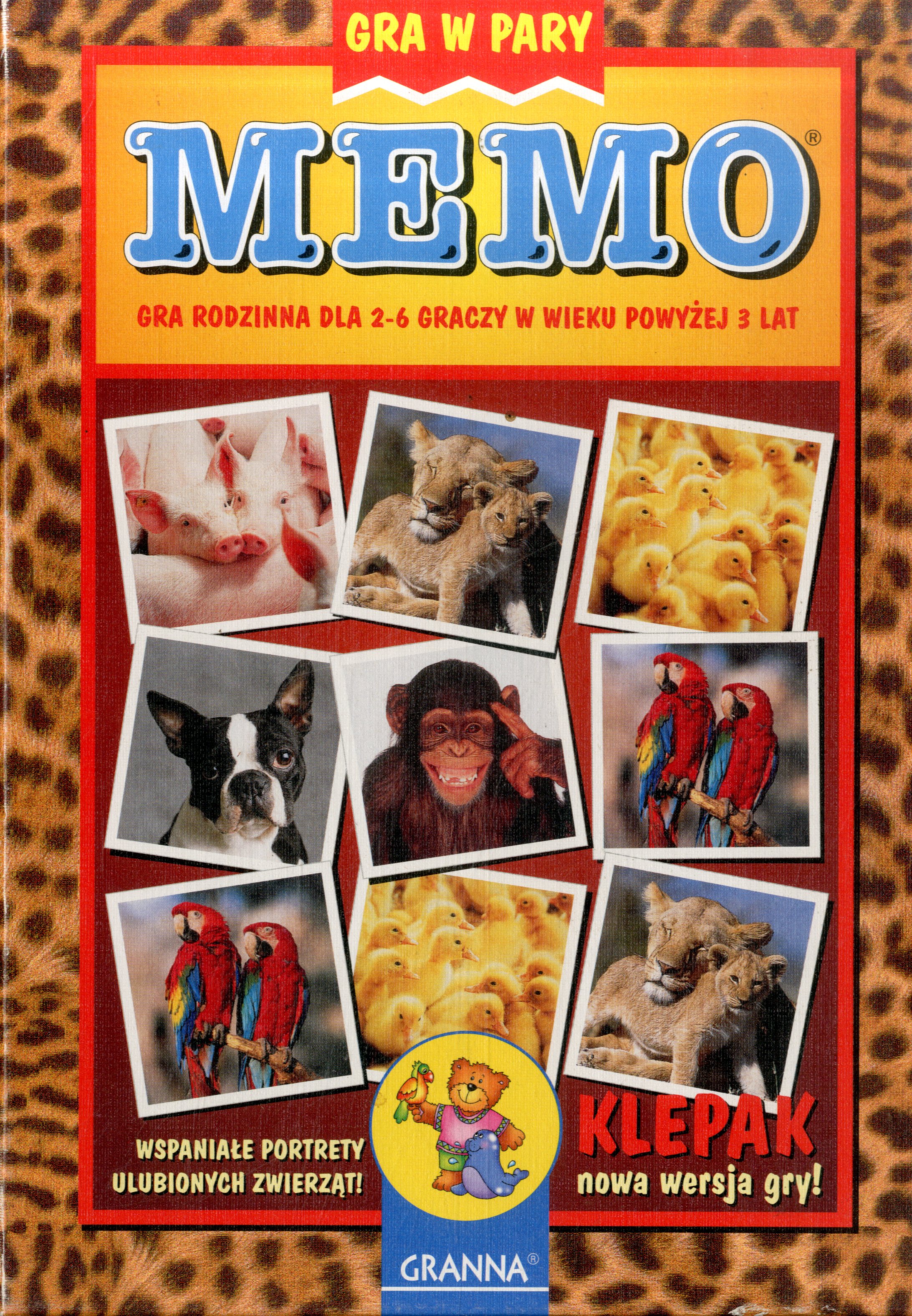 Memo : gra w pary. - Warszawa : Granna [2010?]. - 76 kartoników ; wym. pudełka 19x27,5x3,5 cm + instrukcja.