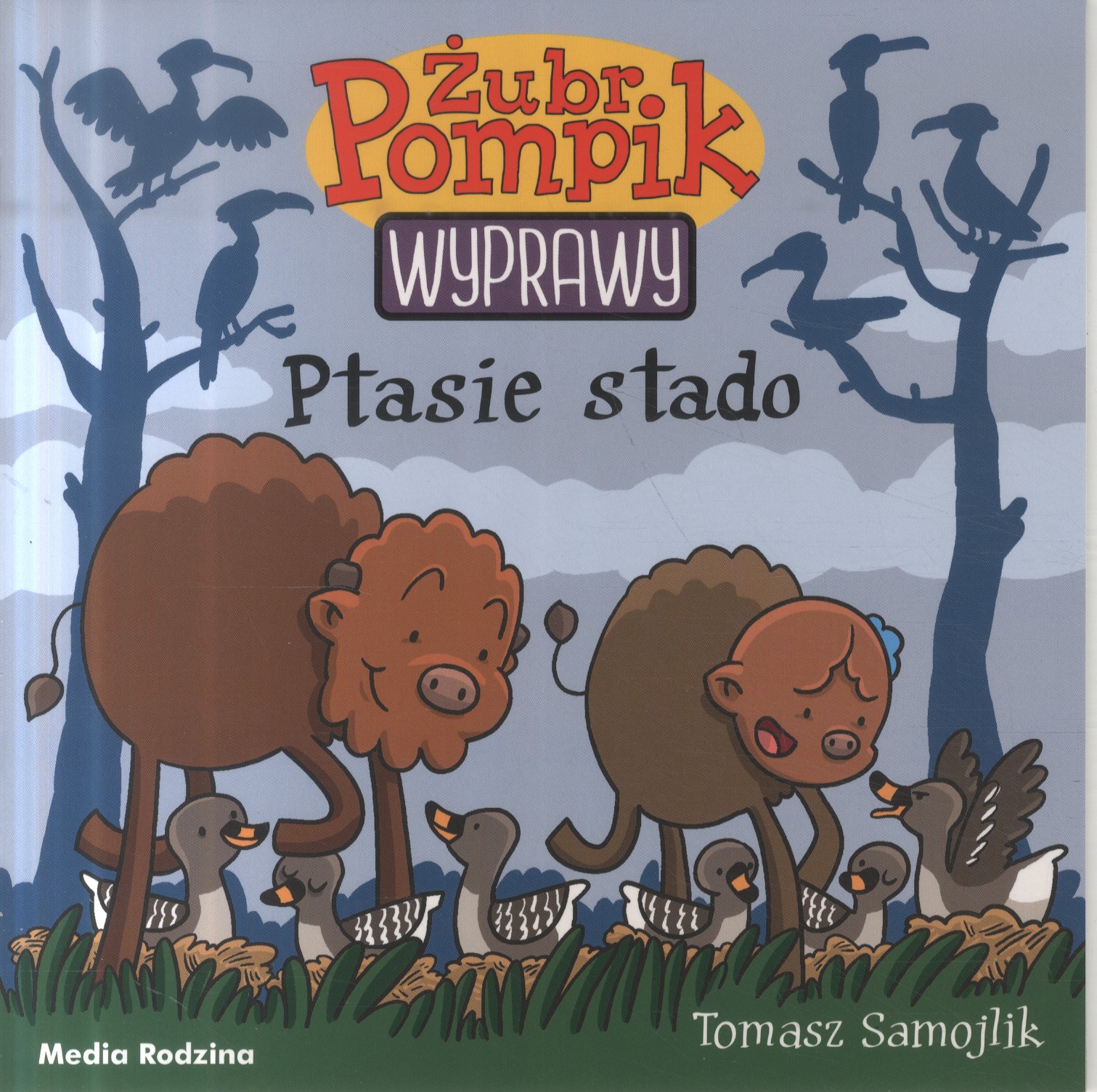 Ptasie stado / [tekst, ilustracje, opracowanie typograficzne] Tomasz Samojlik. - Poznań : Media Rodzina, copyright 2018. - 22, [2] strony, [2] karty tablic : ilustracje kolorowe ; 19 cm.