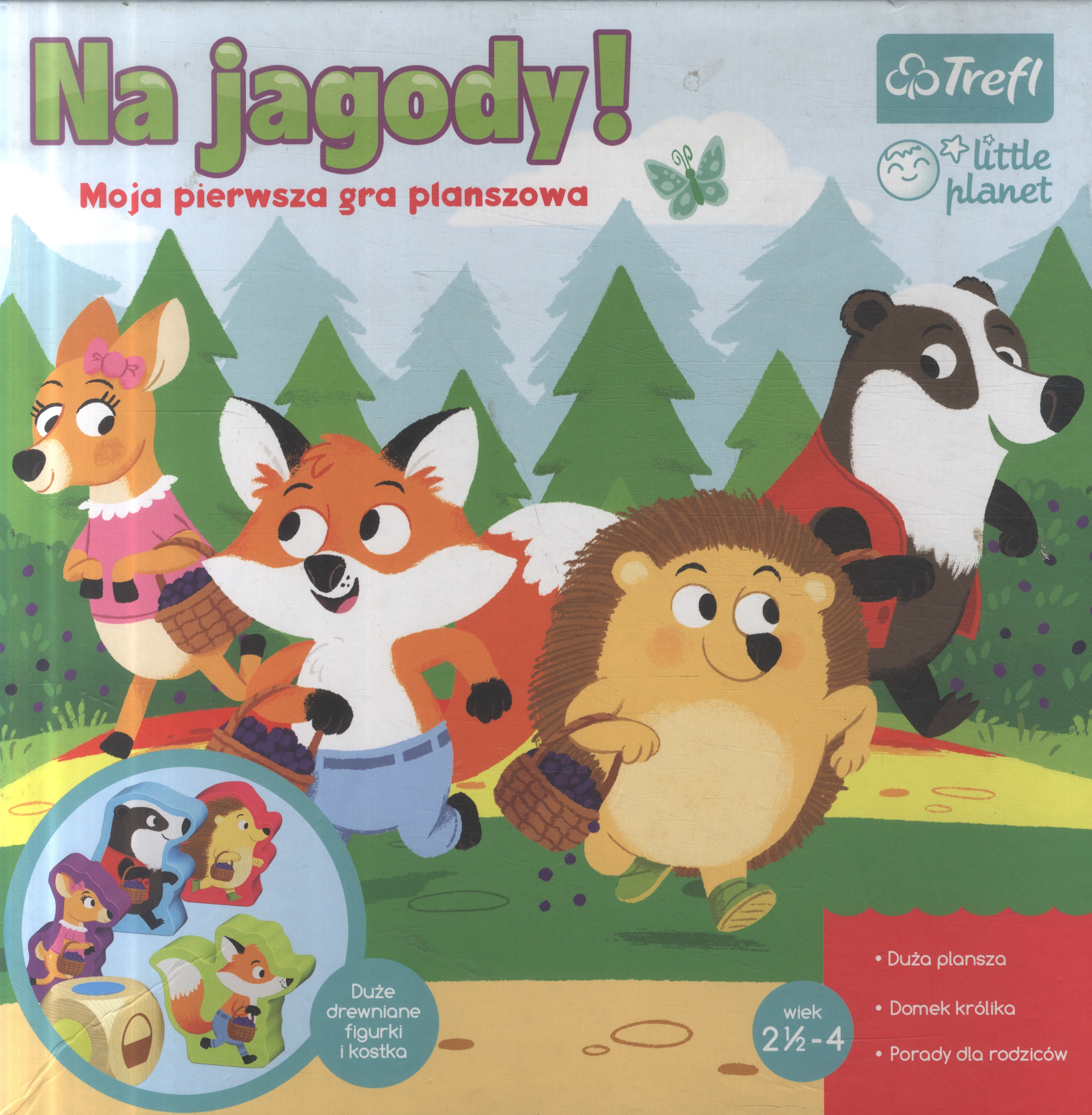 Zawartość pudełka: plansza, model domku królika, 4 drewniane figurki, duża kostka, żetony oraz kartonik z postacią królika, instrukcja do gry z poradami dla rodziców.