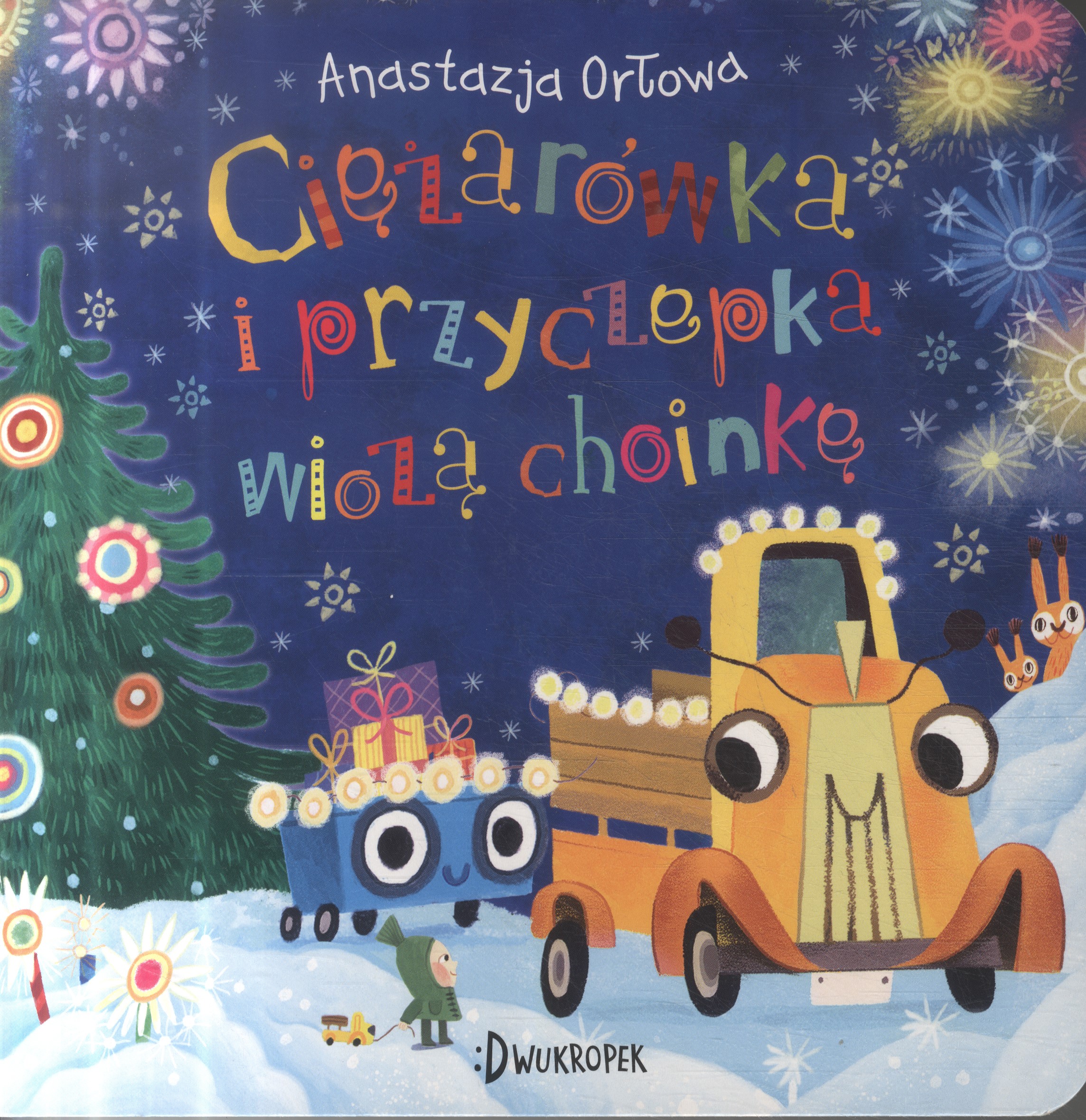 Cężarówka i przyczepka jadą po choinkę. Ale najpierw ciężarówka musi obudzić śpiącą przyczepkę, przedrzeć się przez śnieżne zaspy, pomóc napotkanemu tirowi. A potem… potem jest całe mnóstwo przygód po drodze.– BI BIIP. – Na plac wjeżdża ciągnik z lampą sygnalizacyjną. Wszyscy rozstępują się na boki. Za ciągnikiem jedzie ciężarówka z przyczepką. Wiozą choinkę. Czerwona szmatka łopocze na wietrze: – FRR, FRR! A za nimi jedzie tir z prezentami. Przyjechał żuraw samochodowy i podniósł choinkę. Umocował ją w stojaku. – Ach! – zakrzyknęły ciężarówka z przyczepką.
