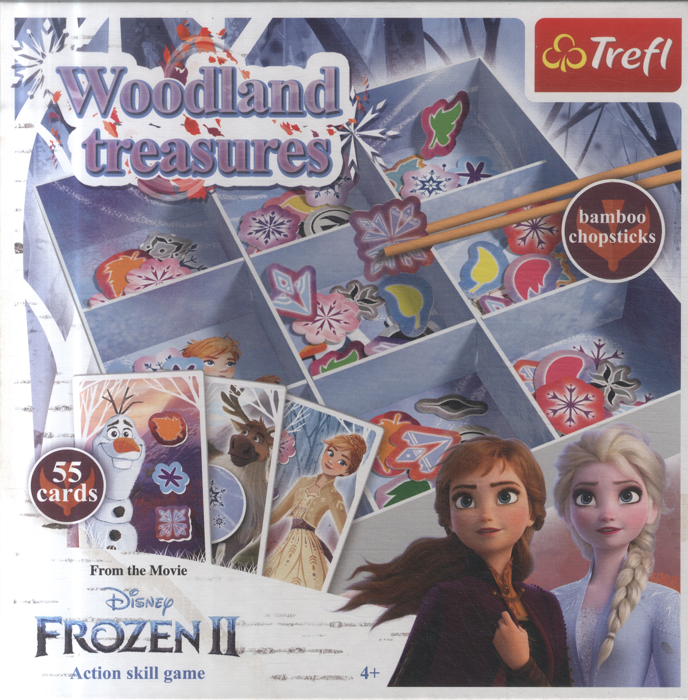 Zawartość pudełka: 60 żetonów z leśnymi skarbami, 6 żetonów specjalnych, 37 kart z zadaniami do pojedynków, 18 kart z zadaniami dla jednego gracza, 2 pary pałeczek bambusowych, separator, kostka, instrukcja.