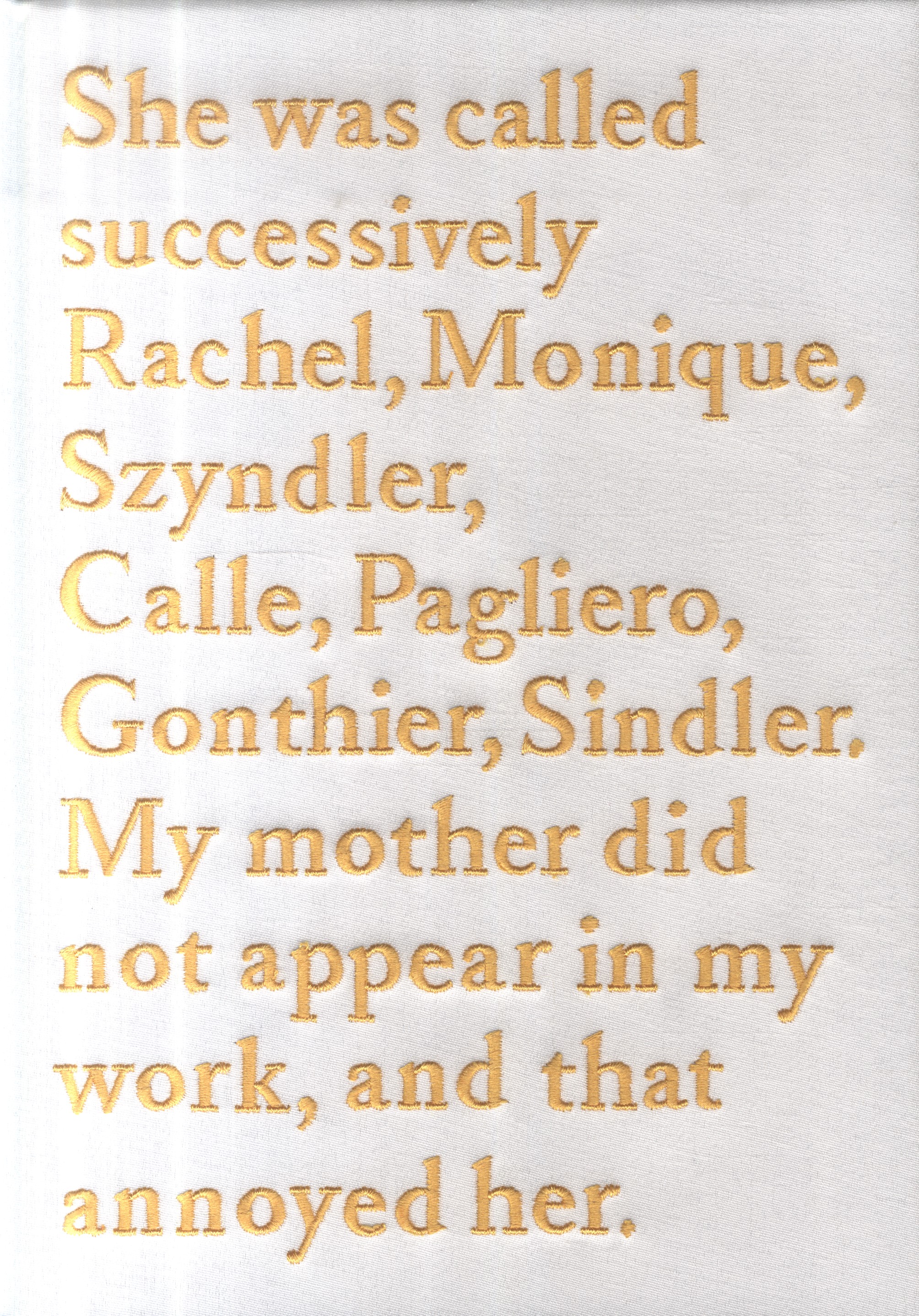 Sophie Calle describes Monique through extracts from personal notebooks and photographs from family albums, and presents her installation created at the Palais de Tokyo in homage to her mother, who died in 2007.