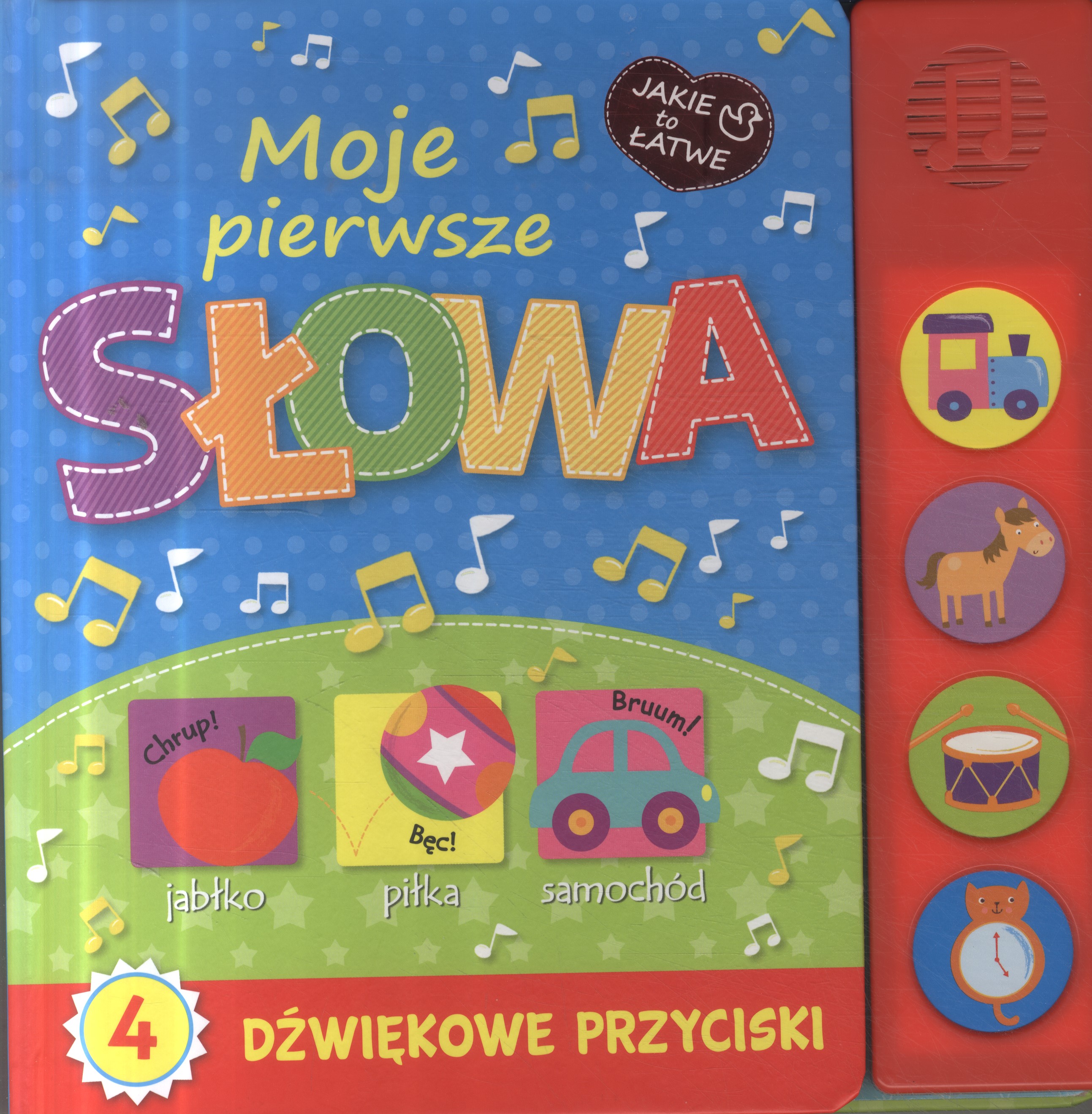 Moje pierwsze słowa : [4 dźwiękowe przyciski]. - Warszawa : Wilga, copyright 2014. - [8] stron : ilustracje ; 23 cm.