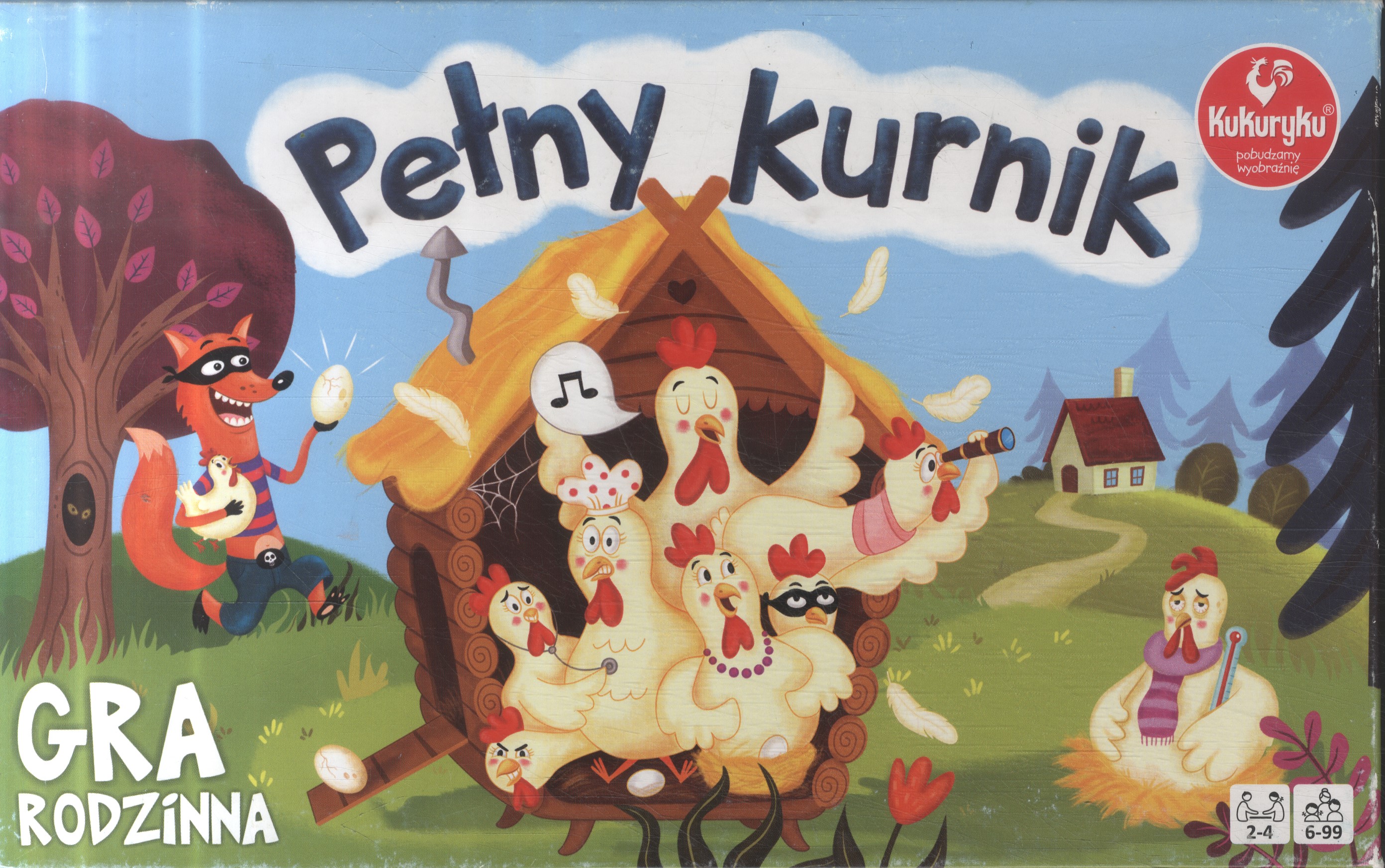 Zawartość pudełka: 56 tafelków z jajkami, 48 tafelków z kurczakami, 36 tafelków z kurami, 4 tafelki z kogutami, 4 karty graczy, 2 kostki do gry, instrukcja.