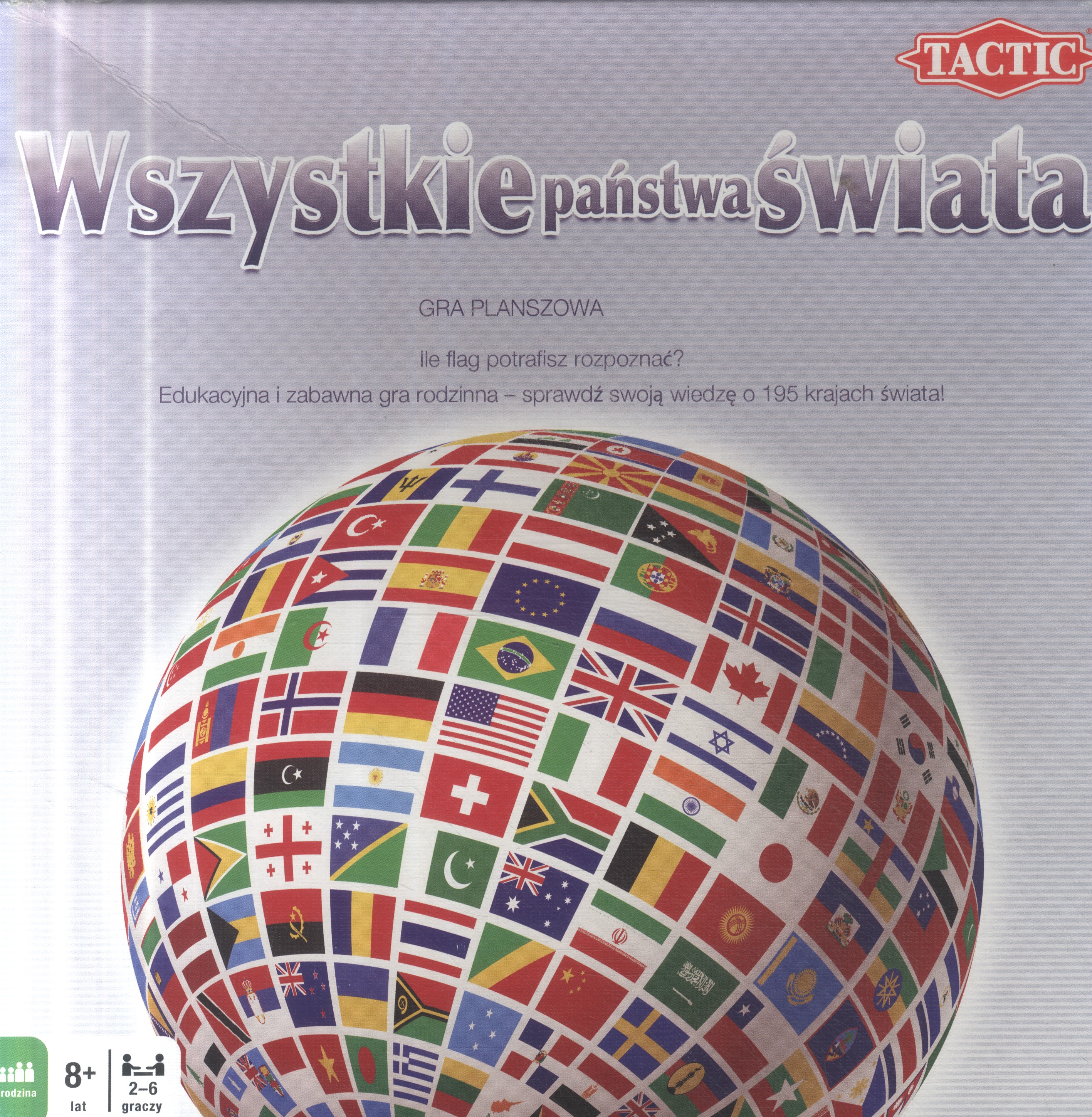 Ile flag potraficie rozpoznać? W grze Wszystkie państwa świata potrzebne będą wiadomości z geografii. Punkty zdobywa się za rozpoznanie państwa po fladze i prawidłowe odpowiedzi na pytania dotyczące danego kraju. Kto uzbiera najwięcej punktów, zwyciężą! Na kartach do każdego pytania podano trzy warianty odpowiedzi - dla utrudnienia można pominąć ich czytanie. W łątwiejszej wersji można po prostu wybierać a, b lub c, co sprawdza się świetnie, kiedy rodzice grają z dziećmi. Zaczynajcie grę i poszerzajcie horyzonty wiedzy w swojej podróży dookoła świata!