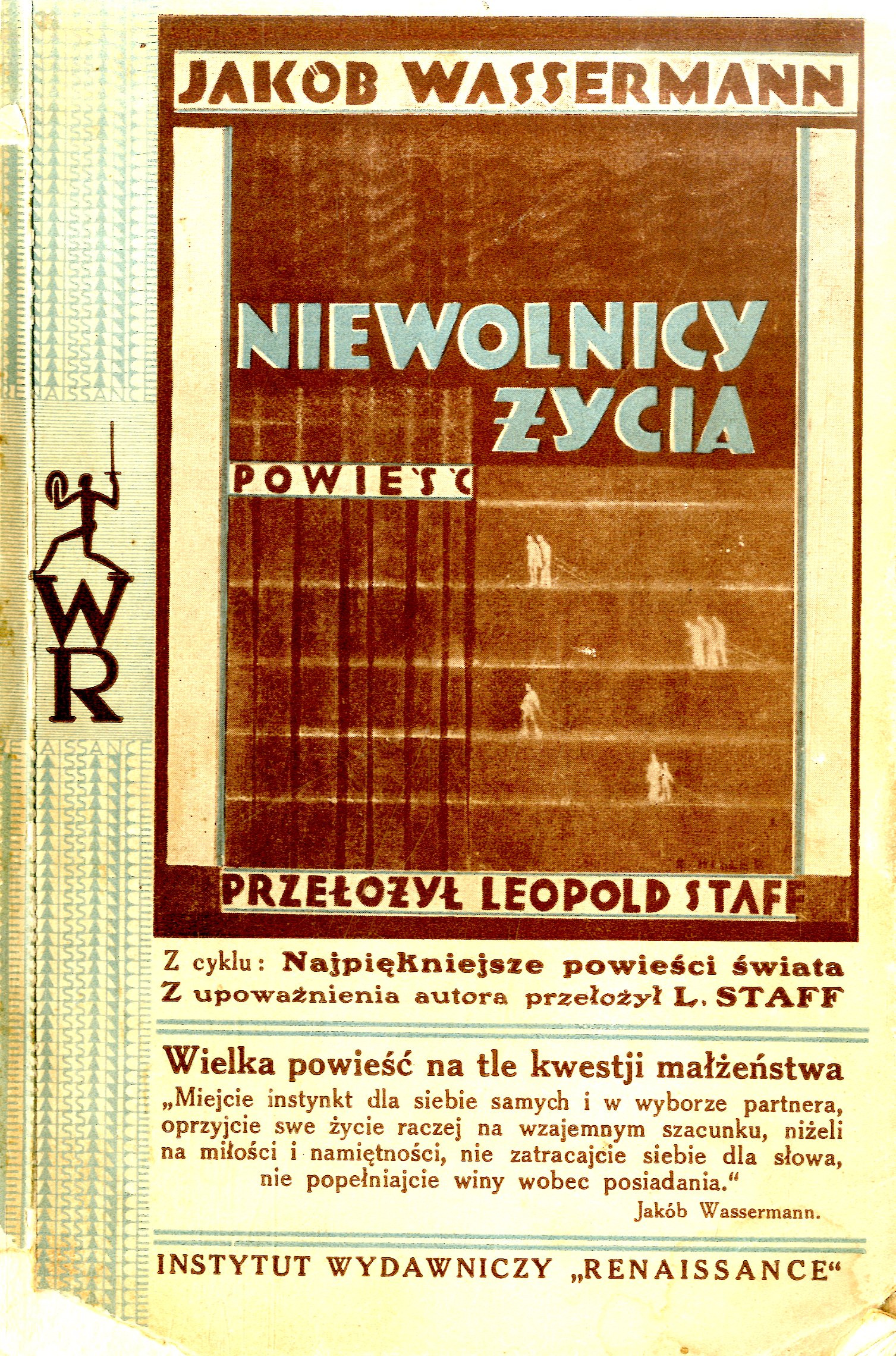 Niewolnicy życia : powieść / Jakub Wassermann ; z upoważn. aut. przeł. L. Staff. - Warszawa : "Renaissance", [1928] (Bydgoszcz : A. Dittmann). - 416 s. ; 23 cm.