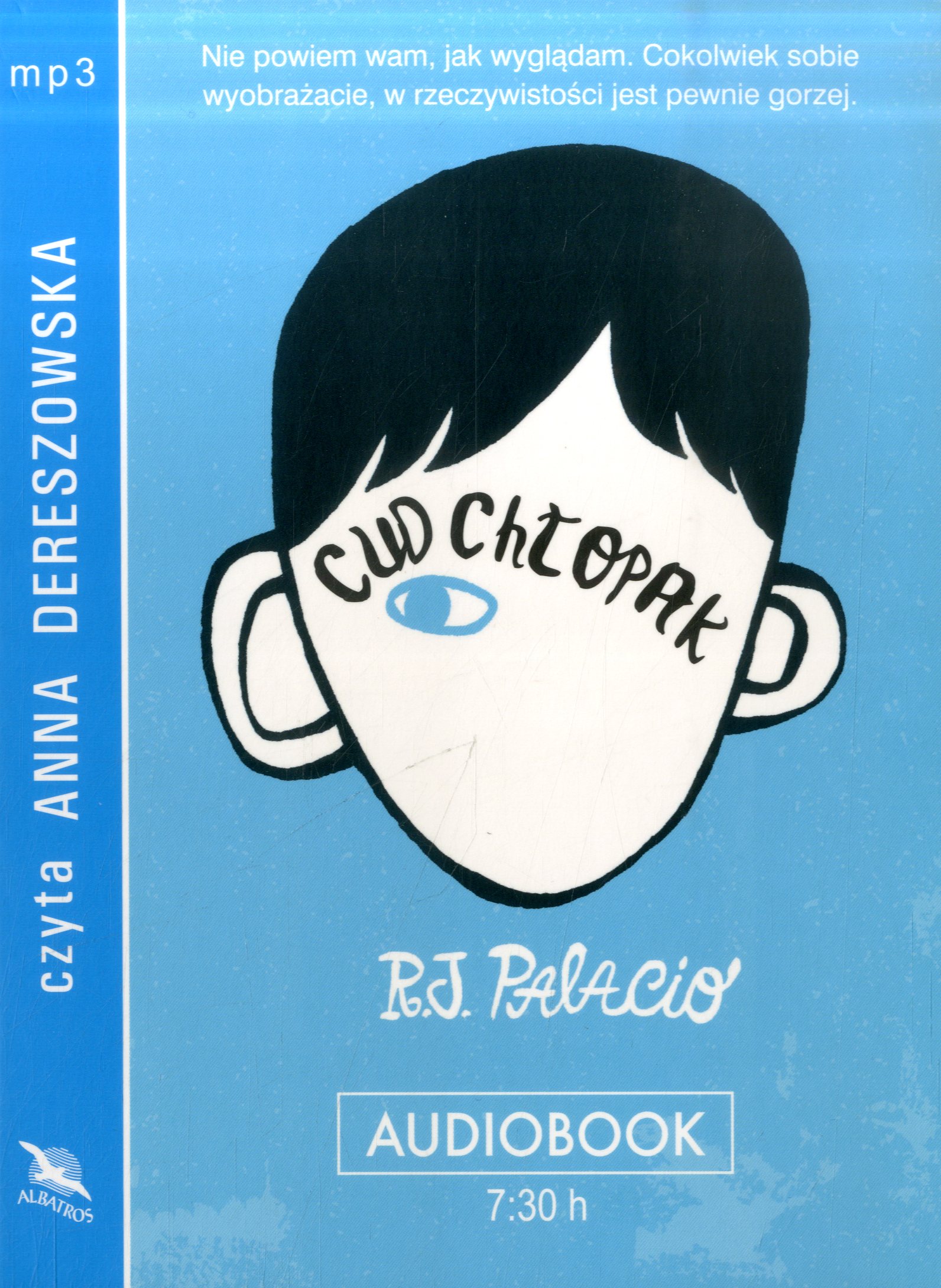 Cud chłopak / R. J. Palacio ; Pol. transl. Maria Olejniczak-Skarsgård. - Warszawa : Wydawnictwo "Albatros" Andrzej Kuryłowicz, cop. 2014. - 1 płyta (CD) (7 godz. 30 min) : digital, stereo. ; 12 cm.