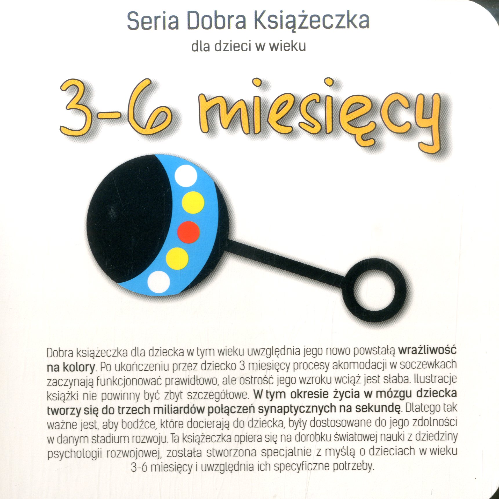 Dobra książeczka dla dziecka w wieku 3-6 miesięcy uwzględnia jego nowo powstałą wrażliwość na kolory. Po ukończeniu przez dziecko 3 miesięcy procesy akomodacji w soczewkach zaczynają funkcjonować prawidłowo, ale ostrość jego wzroku wciąż jest słaba. Ilustracje książki nie powinny być zbyt szczegółowe. W tym okresie życia w mózgu dziecka tworzy się do trzech miliardów połączeń synaptycznych na sekundę.