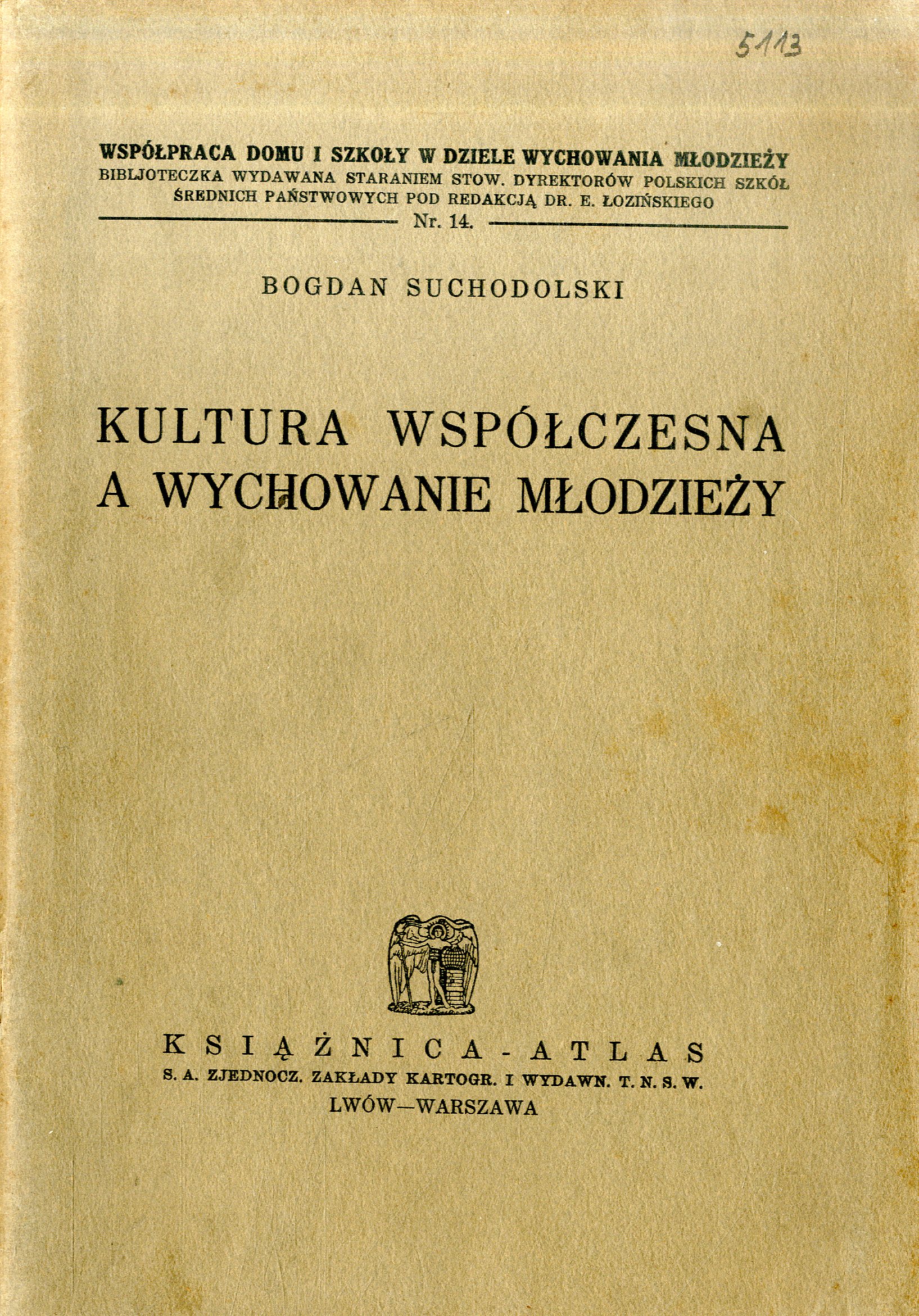 Kultura współczesna a wychowanie młodzieży / Bogdan Suchodolski. - Lwów ; Warszawa : Książnica-Atlas, [1935] (Lwów : Książnica-Atlas). - 55, [1] s. ; 21 cm.