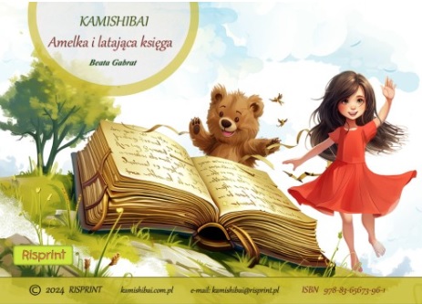 Amelka i latająca księga : kamishibai / Beata Gabrat. - [Płock] : Risprint, © 2024. - Teka (12 kart tablic luzem) : ilustracje ; 30x42 cm.